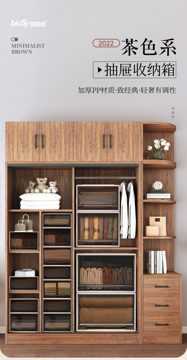 百草园收纳箱抽屉式收纳柜储物柜床头柜内衣收纳盒整理箱42L3个装茶色