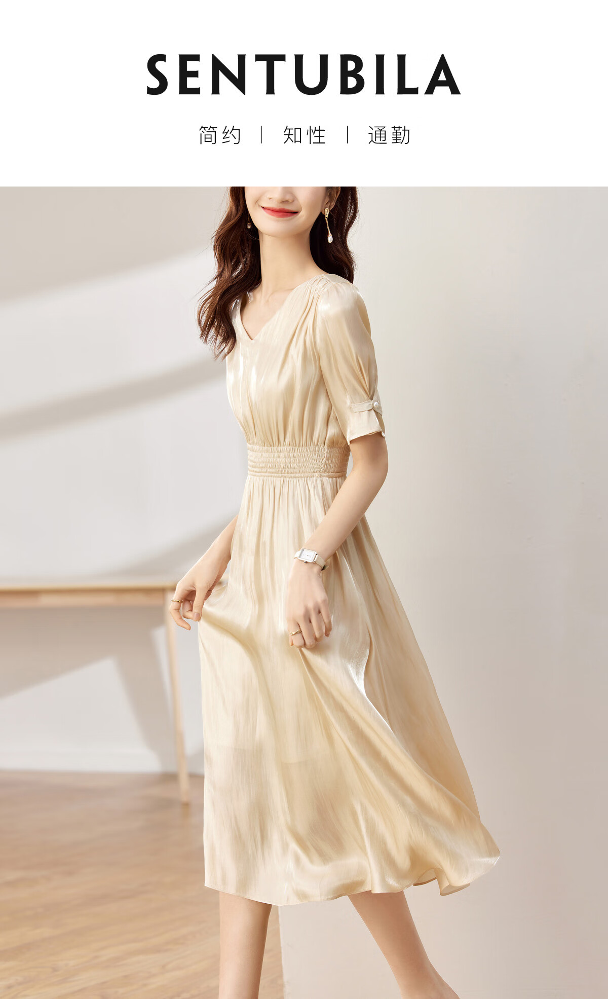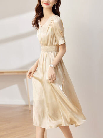 尚都比拉气质女神范法式连衣裙2023夏季女装遮肚子显瘦长裙 杏色 S